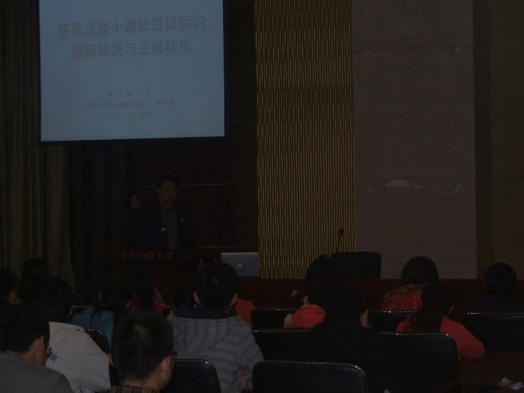 为了深入学习、领会党的十八大精神,并将其贯彻到学习、科研和教学中去,11月14日晚,122cc太阳集成游戏经济学部、长江上游经济研究中心联合邀请中国社科院投融资研究中心主任董裕平研究员在田家炳书院408学术报告厅作了题为《党的“十八大”精神解读——实现小康社会目标的国际经济与金融环境》学术报告。报告由财政金融学院副院长毛跃一教授、中心专职研究人员唐路元教授共同主持,参加报告的有长江上游经济研究中心常务副主任文传浩教授、副主任杨文举教授、财政金融学院党总支副书记刘代成、靳景玉教授和部分应用经济学教师,以及应用经济学相关专业和思政学院的研究生、本科生。