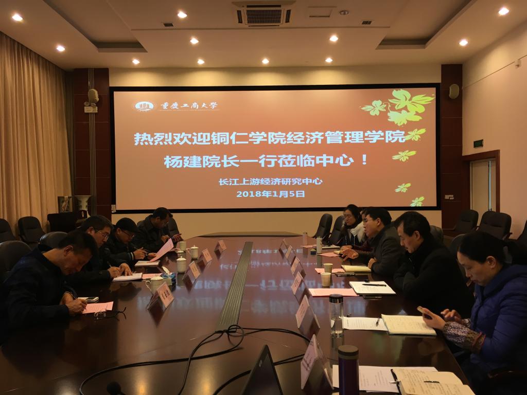 2018年1月5日,铜仁学院经济管理学院院长杨建教授、陈俭副教授、翟玉胜教授、王友云教授莅临中心交流合作事宜。中心副主任杨文举教授、中心副主任饶光明教授以及相关人员参加了座谈交流。