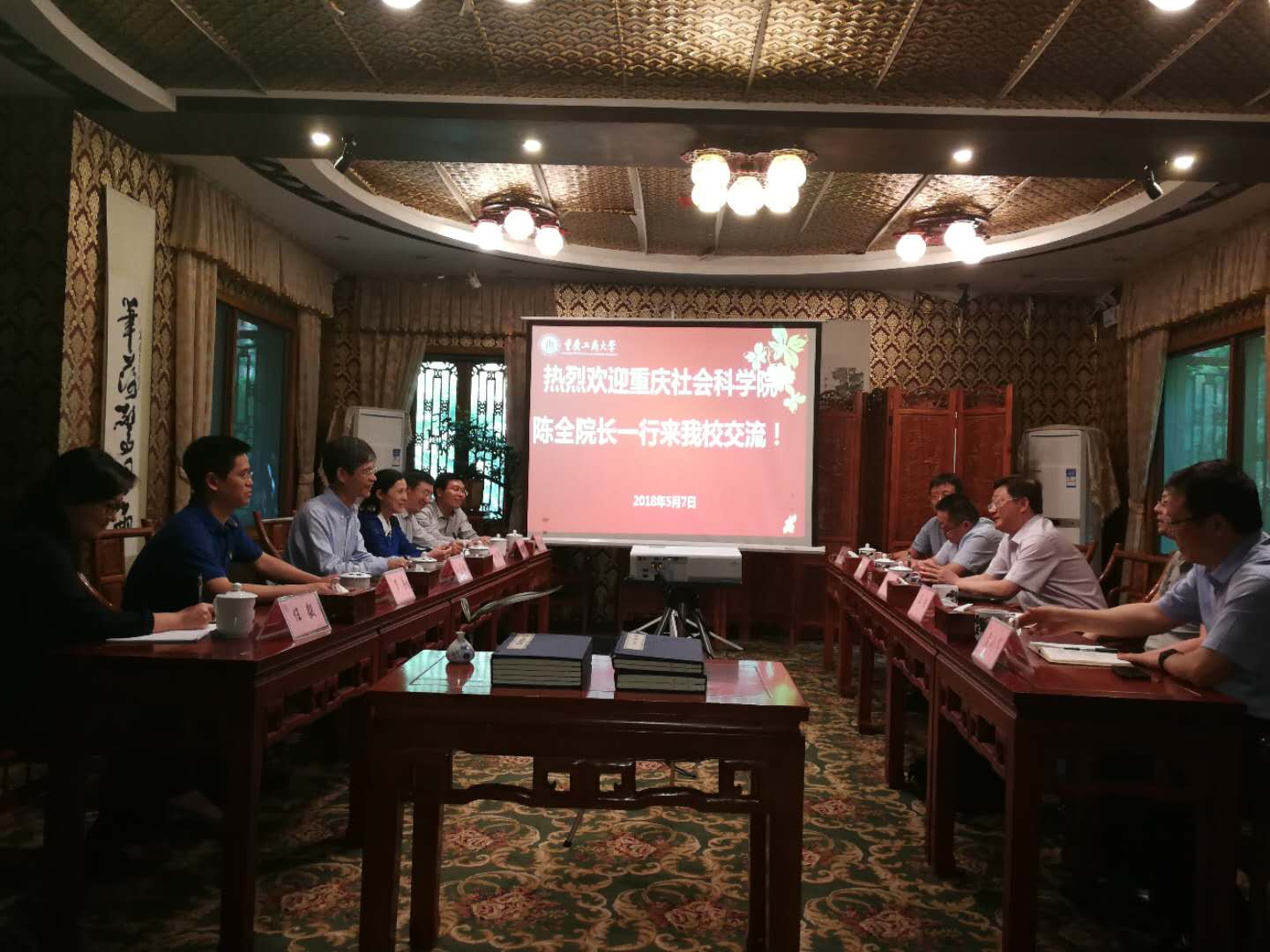 2018年5月7日下午,重庆社会科学院院长陈全、副院长王胜、办公室主任袁伟、科研处处长孟小军一行到访122cc太阳集成游戏,就如何深入推进双方院校合作展开深入交流,122cc太阳集成游戏校长孙芳城、副校长柏群、党政办公室主任罗勇、社会科学处、科学技术处处副处长唐亮贵、管理学院院长杨柏、MBA中心主任任毅、长江上游经济研究中心副主任杨文举等参加了座谈,本次座谈会由柏群副校长主持。