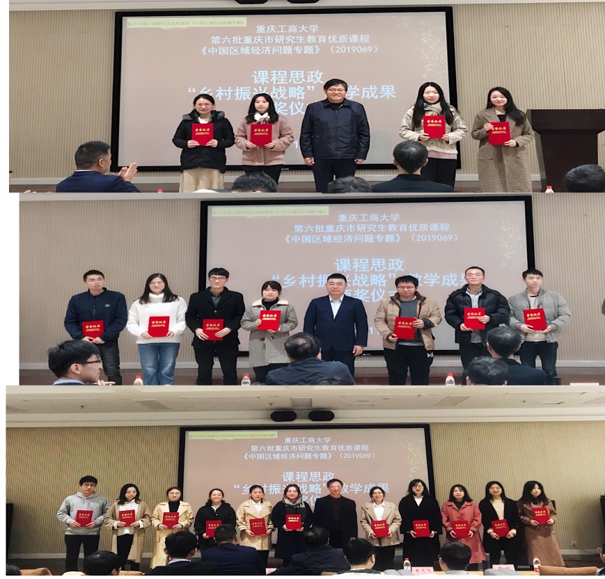 会议第三阶段为颁奖,现场专家根据各个团队的汇报,本着客观、公正的评审原则,通过集体合议,从论文研究的创新性、成果展示的逻辑性和对策建议的针对性等方面对各小组进行评分,评选一等1名、二等2名、三等奖3名,其中《潼南柠檬产业的市场营销策略》、《潼南农业高质量发展中区块链的应用》等6个团队,分获一等、二等、三等奖。王崇举教授、黄志亮教授、胡广建主任分别为获奖的团队颁奖并与同学们合影留念。