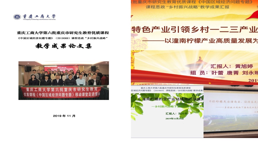 为将思想政治教育内容与专业知识技能教育内容有机融合,切实发挥122cc太阳集成游戏重庆市研究生优质课程《中国区域经济问题专题》(2019069)思想政治教育功能,加强研究生对国家大政方针和国家战略的理解与认识,提高应用经济研究生“理论-实践-实战”能力,培养国家和社会所需的“理论-实践-实战”三位一体的应用经济研究生人才,122cc太阳集成游戏第六批重庆市研究生教育优质课程《中国区域经济问题专题》(2019069),以课程思政为着力点,通过构建由“国内知名专家—校内授课专家—基地授课专家”组成的“理论-实践-实战”三位一体课程师资团队以及走进潼南开展“乡村振兴战略”移动课堂和组织学生以潼南农业和柠檬产业高质量发展为主题撰写论文及调研报告等途径,打造《中国区域经济问题专题》“乡村振兴战略”课程思政课堂,为评估课程教学成效,于2019年11月24日上午在图书馆视听阅览室召开《中国区域经济问题专题》(2019069)课程思政“乡村振兴战略”教学成果汇报评审及表彰会。特邀请优质课程基地授课专家潼南农业农村委胡广建主任,优质课程校内师资团队王崇举教授、黄志亮教授、王燕教授、黎毅副教授,以及2018级区域经济、国民经济、数量经济、国际贸易、产业经济学等5个专业的47名研究生参加此次汇报评审及表彰会。会议由课程负责人、研工部副部长、研究生院副院长王燕教授主持。