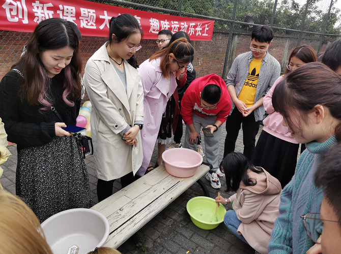 本次活动首先进行了研究生创新课题分享环节,由研二师兄师姐与研一新生交流创新项目申报相关事宜,还分享了做科研创新项目、撰写学术论文相关经验。分享环节之后趣味运动会正式开始,运动会设置了5个比赛项目,分别是:“夹弹珠”、“搬运乒乓球”、“写数字”、“两人三足球踩气球”和“穿针引线”。活动之初,大家随机分成了六个小组,裁判宣读了比赛规则;随后,每一个项目都在裁判的口哨声中下顺利开展,同学们热情高涨,氛围生动而有趣;最后,第五组在同学们的欢呼声中获得了第一名!