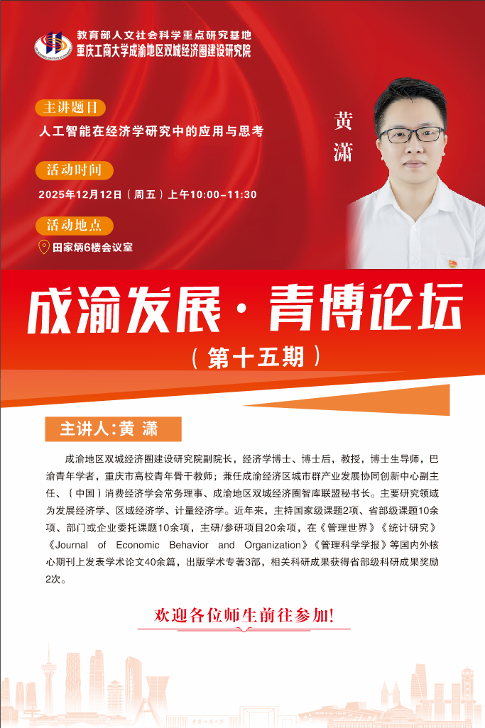 黄潇,成渝地区双城经济圈建设太阳成集团tyc122cc副院长,经济学博士、博士后,教授,博士生导师,巴渝青年学者,重庆市高校青年骨干教师;兼任成渝经济区城市群产业发展协同创新中心副主任、(中国)消费经济学会常务理事、成渝地区双城经济圈智库联盟秘书长。主要研究领域为发展经济学、区域经济学、计量经济学。近年来,主持国家级课题2项、省部级课题10余项、部门或企业委托课题10余项,主研/参研项目20余项,在《管理世界》《统计研究》《Journal of Economic Behavior and Organization》《管理科学学报》等国内外核心期刊上发表学术论文40余篇,出版学术专著3部,相关科研成果获得省部级科研成果奖励2次。