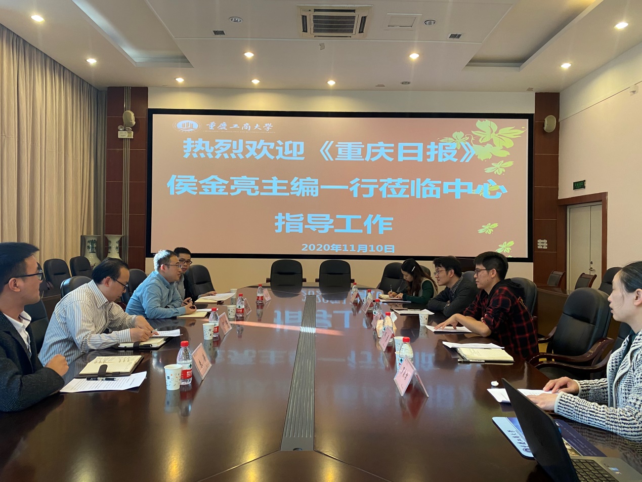 2020年11月10日下午,《重庆日报》思想周刊执行主编、两江观察时政新媒体执行主编侯金亮与执行副主编何旭、责任编辑程正龙、编辑朱涛一行莅临重庆工商大学长江上游经济研究中心,与中心洽谈相关合作事宜。中心副主任易淼、专职研究员周建超以及中心办公室刘霜、邓勇、罗家君与来宾座谈。