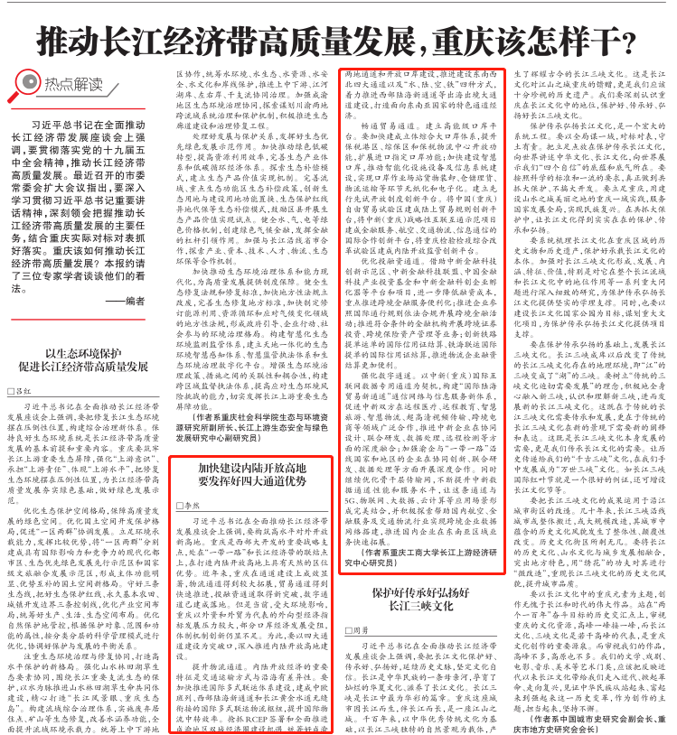 编者按——习近平总书记在全面推动长江经济带发展座谈会上强调,要贯彻落实党的十九届五中全会精神,推动长江经济带高质量发展。最近召开的市委常委会扩大会议指出,要深入学习贯彻习近平总书记重要讲话精神,深刻领会把握推动长江经济带高质量发展的主要任务,结合重庆实际对标对表抓好落实。重庆该如何推动长江经济带高质量发展?