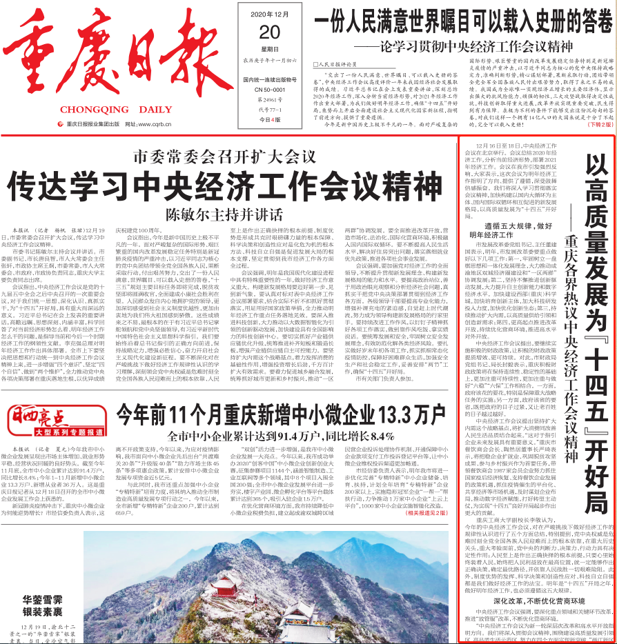 重庆工商大学副校长、长江上游经济研究中心常务副主任李敬教授就此接受《重庆日报》采访。李敬教授表示,今年的中央经济工作会议,对在严峻挑战下做好经济工作的规律性认识进行了五个方面总结,特别提到,党中央权威是危难时刻全党全国各族人民迎难而上的根本依靠,在重大历史关头,重大考验面前,党中央的判断力、决策力、行动力具有决定性作用;人民至上是作出正确抉择的根本前提,只要心里始终装着人民,始终把人民利益放在最高位置,就一定能够作出正确决策,确定最优路径,并依靠人民战胜一切艰难险阻。此外,制度优势的发挥、科学决策和创造性应对、科技自立自强都是我们做好经济工作的法宝。明年是“十四五”开局之年,做好明年经济工作,也必须遵循这五大规律。