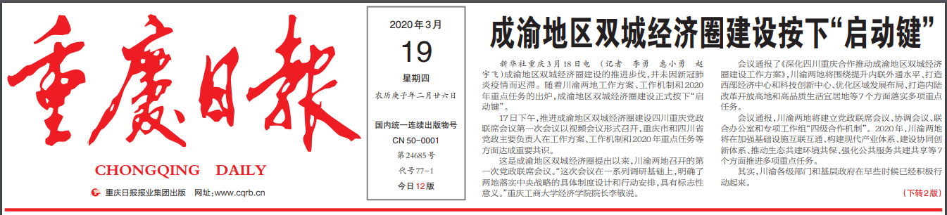 17日下午,推进成渝地区双城经济圈建设四川重庆党政联席会议第一次会议以视频会议形式召开,重庆市和四川省党政主要负责人在工作方案、工作机制和2020年重点任务等方面达成重要共识。就此,重庆工商大学长江上游经济研究中心常务副主任李敬研究员接受《重庆日报》采访。
