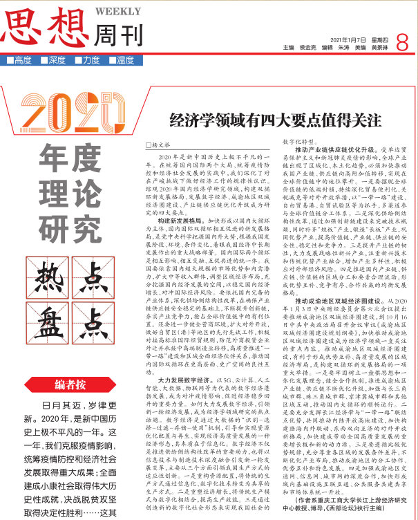 日月其迈,岁律更新。2020年,是新中国历史上极不平凡的一年。这一年,我们克服疫情影响,统筹疫情防控和经济社会发展取得重大成果;全面建成小康社会取得伟大历史性成就,决战脱贫攻坚取得决定性胜利……这其中都离不开坚实的理论支撑。科学理论是我们应对重大挑战、抵御重大风险、解决重大问题的“金钥匙”。重庆日报简要梳理了马克思主义理论、政治学、经济学、社会学等领域的理论研究热点,邀请相关专家学者进行解读,推出“2020年度理论研究热点盘点”专版,以期与读者一同感受理论的力量。