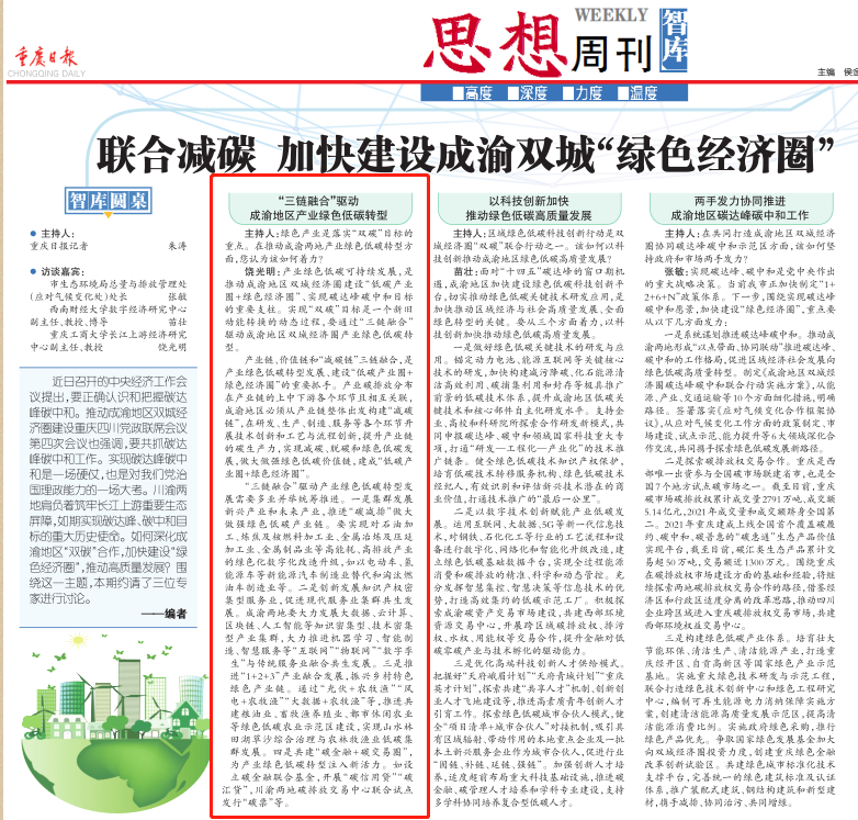 饶光明:产业绿色低碳可持续发展,是推动成渝地区双城经济圈建设“低碳产业圈+绿色经济圈”、实现碳达峰碳中和目标的重要支柱。实现“双碳”目标是一个新旧动能转换的动态过程,要通过“三链融合”驱动成渝地区双城经济圈产业绿色低碳转型。