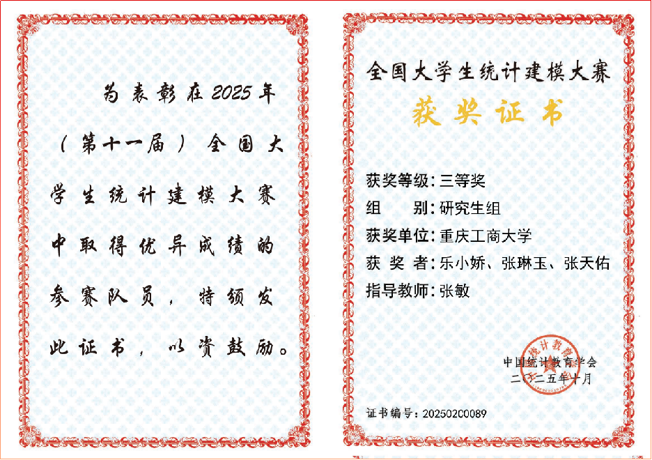 近日,第十一届全国大学生统计建模大赛结果揭晓。由太阳成集团tyc122cc专职研究员张敏副教授担任指导老师、2023级数量经济学专业硕士研究生乐小娇等组成的团队,其参赛作品《数字经济行业效率影响因素与路径提升研究——基于新质生产力视角的随机森林算法实证分析》表现优异,荣获全国三等奖。