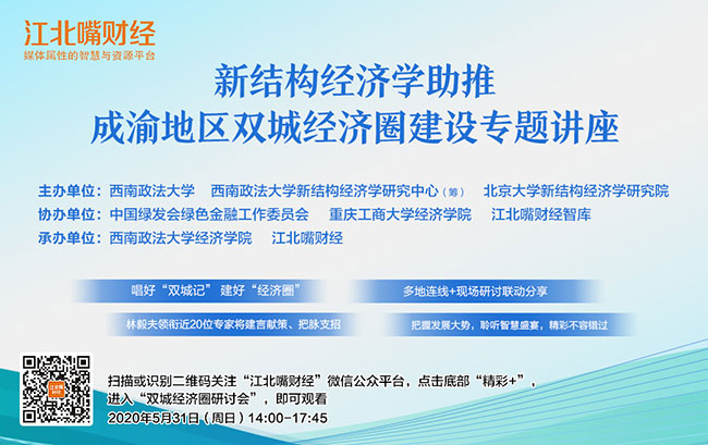 2020年5月31日,由西南政法大学、西南政法大学新结构经济学研究中心(筹)、北京大学新结构经济学太阳成集团tyc122cc主办,重庆工商大学经济学院、中国绿发会绿色金融工作委员会、江北嘴财经智库协办,西南政法大学经济学院和江北嘴财经承办的“新结构经济学助推成渝地区双城经济圈建设”专题讲座,在西南政法大学成功举行。