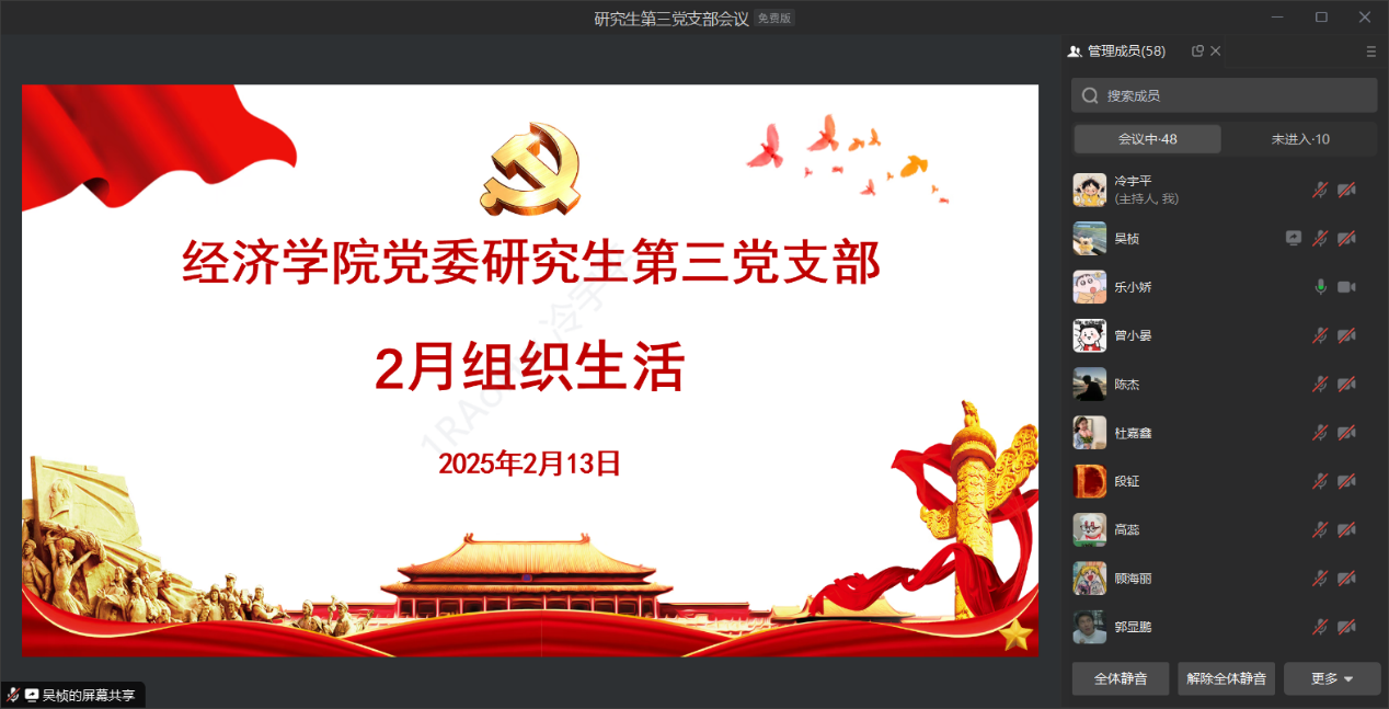 2025年2月13日,经济学院党委研究生第三党支部通过企业微信线上开展2月组织生活。支部党员围绕习近平总书记重要文章《进一步全面深化改革中的几个重大理论和实践问题》(《求是》2025年第2期)进行学习和研讨。