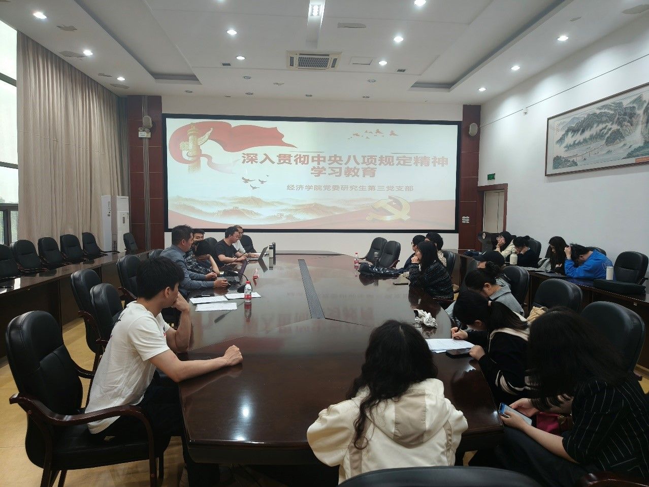2025年4月29日,经济学院党委研究生第三党支部在田家炳书院6楼会议室开展4月组织生活。落实上级党组织关于扎实开展深入贯彻中央八项规定精神学习教育的要求,支部党员开展集体学习和研讨。