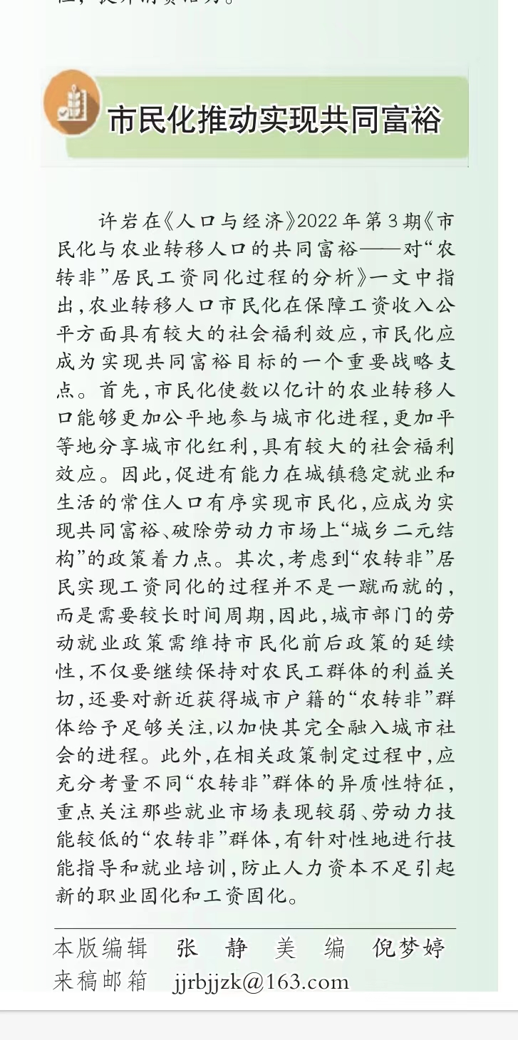 许岩在《人口与经济》2022年第3期《市民化与农业转移人口的共同富裕——对“农转非”居民工资同化过程的分析》一文中指出,农业转移人口市民化在保障工资收入公平方面具有较大的社会福利效应,市民化应成为实现共同富裕目标的一个重要战略支点。首先,市民化使数以亿计的农业转移人口能够更加公平地参与城市化进程,更加平等地分享城市化红利,具有较大的社会福利效应。因此,促进有能力在城镇稳定就业和生活的常住人口有序实现市民化,应成为实现共同富裕、破除劳动力市场上“城乡二元结构”的政策着力点。其次,考虑到“农转非”居民实现工资同化的过程并不是一蹴而就的,而是需要较长时间周期,因此,城市部门的劳动就业政策需维持市民化前后政策的延续性,不仅要继续保持对农民工群体的利益关切,还要对新近获得城市户籍的“农转非”群体给予足够关注,以加快其完全融入城市社会的进程。此外,在相关政策制定过程中,应充分考量不同“农转非”群体的异质性特征,重点关注那些就业市场表现较弱、劳动力技能较低的“农转非”群体,有针对性地进行技能指导和就业培训,防止人力资本不足引起新的职业固化和工资固化。
