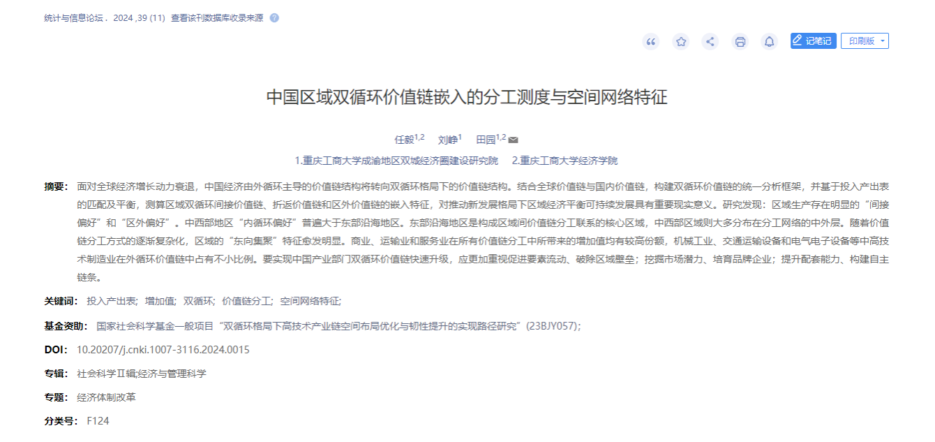 2024年9月,太阳成集团tyc122cc任毅教授、2021级区域经济学硕士研究生刘峥、太阳成集团tyc122cc田园副教授在重要学术期刊《统计与信息论坛》发表学术论文《中国区域双循环价值链嵌入的分工测度与空间网络特征》。