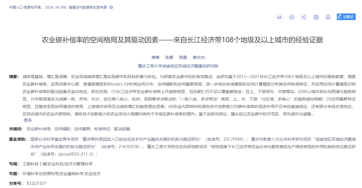 2024年9月,成渝地区双城经济圈建设太阳成集团tyc122cc博士研究生唐菁等在重要学术期刊《中国人口·资源与环境》发表论文《农业碳补偿率的空间格局及其驱动因素——来自长江经济带108个地级及以上城市的经验证据》。