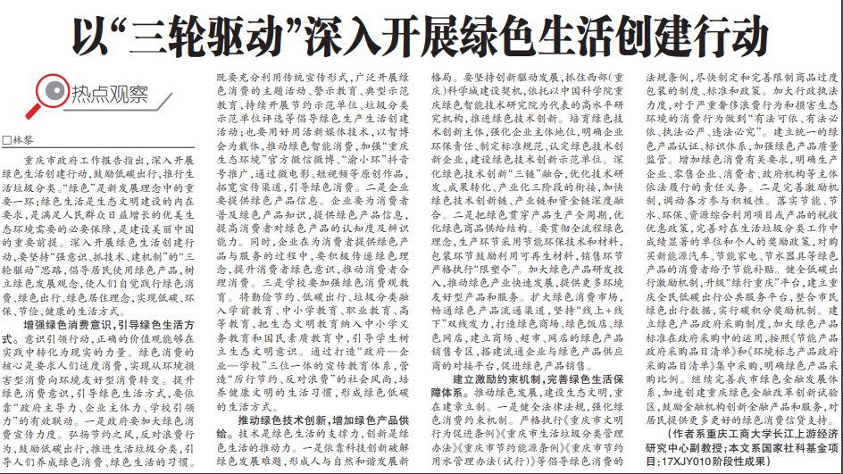 推动绿色技术创新,增加绿色产品供给。技术是绿色生活的支撑力,创新是绿色生活的推动力。一是依靠科技创新破解绿色发展难题,形成人与自然和谐发展新格局。要坚持创新驱动发展,抓住西部(重庆)科学城建设契机,依托以中国科学院重庆绿色智能技术太阳成集团tyc122cc为代表的高水平研究机构,推进绿色技术创新。培育绿色技术创新主体,强化企业主体地位,明确企业环保责任、制定标准规范、认定绿色技术创新企业,建设绿色技术创新示范单位。深化绿色技术创新“三链”融合,优化技术研发、成果转化、产业化三阶段的衔接,加快绿色技术创新链、产业链和资金链深度融合。二是把绿色贯穿产品生产全周期,优化绿色商品供给结构。要贯彻全流程绿色理念,生产环节采用节能环保技术和材料,包装环节鼓励利用可再生材料,销售环节严格执行“限塑令”。加大绿色产品研发投入,推动绿色产业快速发展,提供更多环境友好型产品和服务。扩大绿色消费市场,畅通绿色产品流通渠道,坚持“线上+线下”双线发力,打造绿色商场、绿色饭店、绿色网店,建立商场、超市、网店的绿色产品销售专区,搭建流通企业与绿色产品供应商的对接平台,促进绿色产品销售。