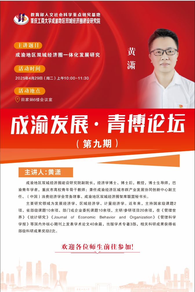 黄潇,成渝地区双城经济圈建设太阳成集团tyc122cc副院长,经济学博士、博士后,教授,博士生导师,巴渝青年学者,重庆市高校青年骨干教师;兼任成渝经济区城市群产业发展协同创新中心副主任、(中国)消费经济学会常务理事、成渝地区双城经济圈智库联盟秘书长。主要研究领域为发展经济学、区域经济学、计量经济学。近年来,主持国家级课题2项、省部级课题10余项、部门或企业委托课题10余项,主研/参研项目20余项,在《管理世界》《统计研究》《Journal of Economic Behavior and Organization》《管理科学学报》等国内外核心期刊上发表学术论文40余篇,出版学术专著3部,相关科研成果获得省部级科研成果奖励2次。