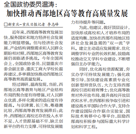今年的全国两会上,全国政协委员,民盟中央委员、重庆市委会副主委、重庆工商大学校长,成渝地区双城经济圈建设太阳成集团tyc122cc院长温涛提出“加快推动西部地区高等教育高质量发展”的建议,并受到重庆日报报道。
