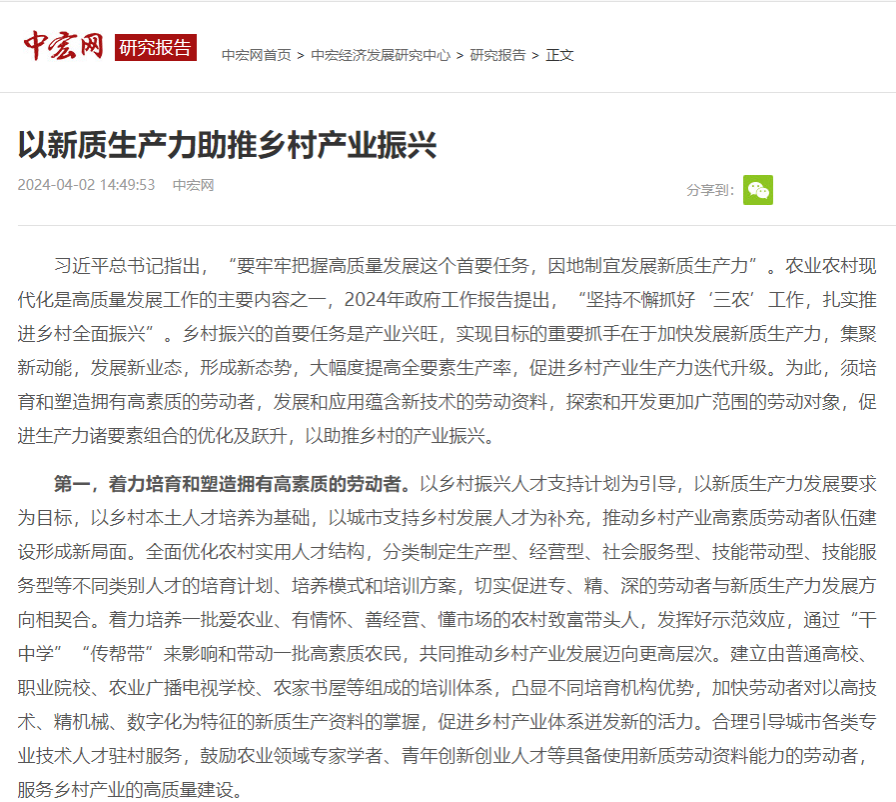 以新质生产力助推乡村产业振兴