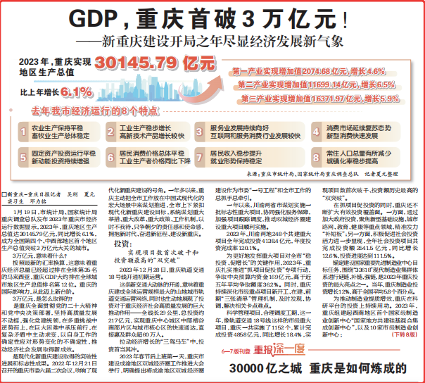 1月19日,市统计局、国家统计局重庆调查总队发布2023年重庆市经济运行数据显示,2023年,重庆地区生产总值达30145.79亿元,同比增长6.1%,成为全国第四个、中西部地区首个地区生产总值突破3万亿元大关的城市。