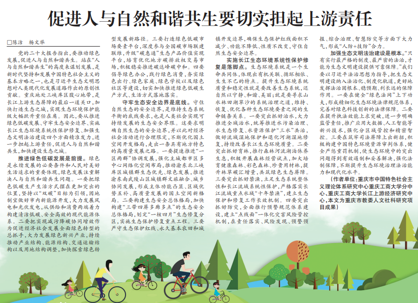 党的二十大报告指出,要推动绿色发展,促进人与自然和谐共生。站在“人与自然和谐共生”的高度来谋划发展,是新时代坚持和发展中国特色社会主义的基本方略之一,也是习近平生态文明思想对人类现代化发展道路作出的原创性贡献。重庆地处三峡库区腹心地带,是长江上游生态屏障的最后一道关口,加快打造生态之城,实现生态环境保护能级大幅跃升重任在肩。因此,要从推进绿色低碳发展、守牢生态安全边界、实施长江生态环境系统性保护修复、加强生态文明法治建设四个方面精准发力,进一步担起上游责任,促进人与自然和谐共生,加快建设生态之城。