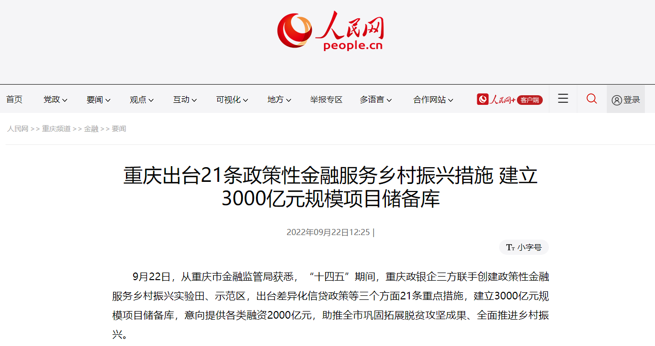 9月22日,从重庆市金融监管局获悉,“十四五”期间,重庆政银企三方联手创建政策性金融服务乡村振兴实验田、示范区,出台差异化信贷政策等三个方面21条重点措施,建立3000亿元规模项目储备库,意向提供各类融资2000亿元,助推全市巩固拓展脱贫攻坚成果、全面推进乡村振兴。