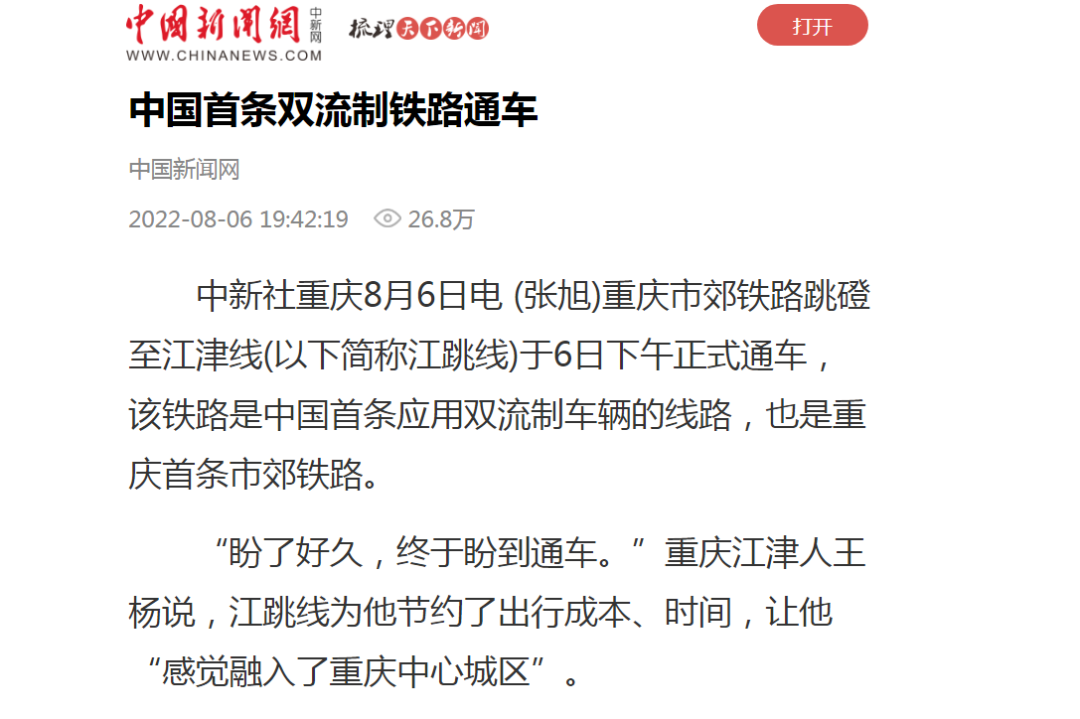 重庆市郊铁路跳磴至江津线(以下简称江跳线)于8月6日下午正式通车,该铁路是中国首条应用双流制车辆的线路,也是重庆首条市郊铁路。