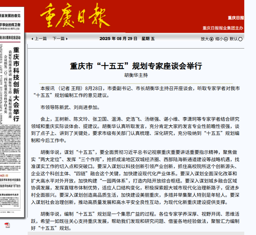 胡衡华说,谋划“十五五”,要全面贯彻习近平总书记视察重庆重要讲话重要指示精神,聚焦做实“两大定位”、发挥“三个作用”,抢抓成渝地区双城经济圈、西部陆海新通道建设等战略机遇,找准谋实工作的切入点和突破口。要深入谋划以科技创新引领产业创新,抓住高校院所这个创新源头、企业这个科创主体、“四链”融合这个关键,加快建设现代化产业体系。要深入谋划全面深化改革和扩大高水平对外开放,加快构建“一园两体系”,打造内陆开放综合枢纽。要深入谋划城乡融合区域协调发展,发挥直辖市体制优势,适应人口结构变化,积极探索超大城市现代化治理新路子,促进乡村全面振兴。要深入谋划创造高品质生活,加快建设美丽重庆,多措并举集聚人特别是年轻人。要深入谋划社会治理创新,推动高质量发展和高水平安全良性互动,为现代化新重庆建设提供支撑。